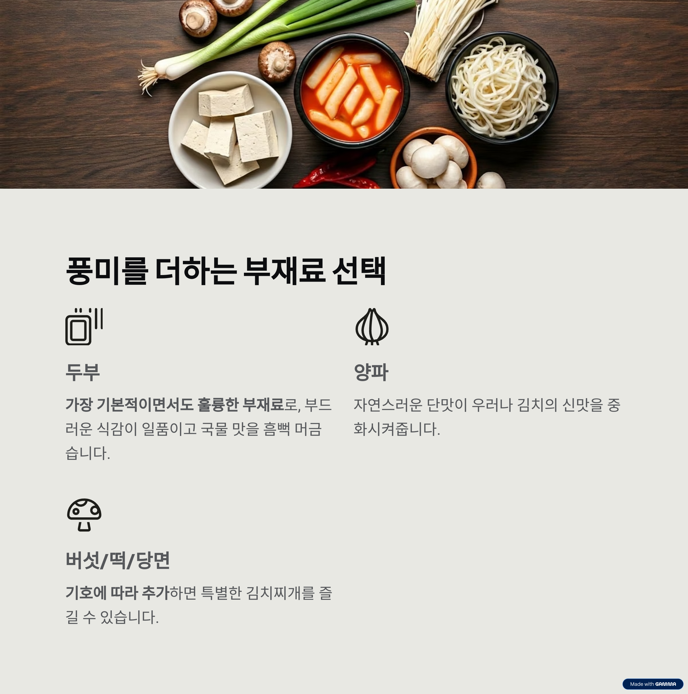 어떤 재료를 선택하든 김치와의 조화가 가장 중요합니다.