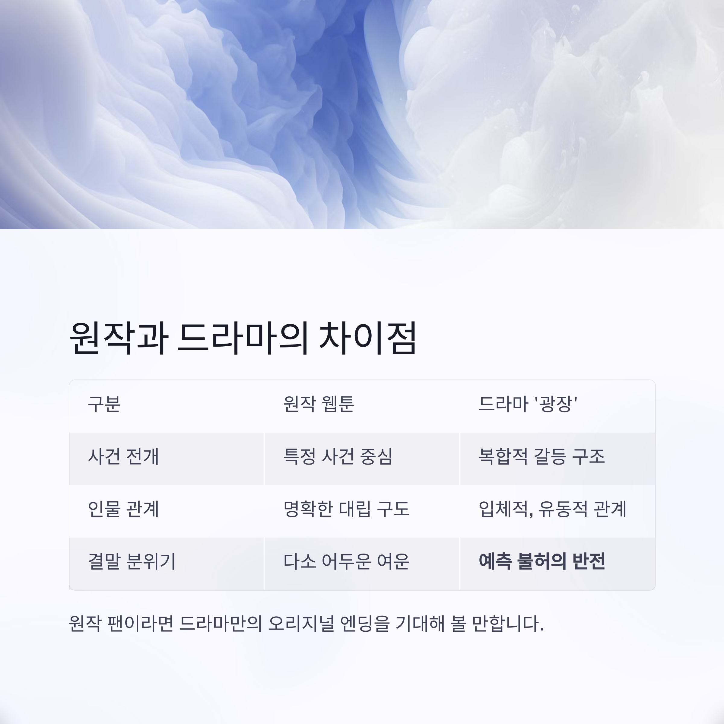 | 구분 | 원작 웹툰 | 드라마 '광장' 예상 |