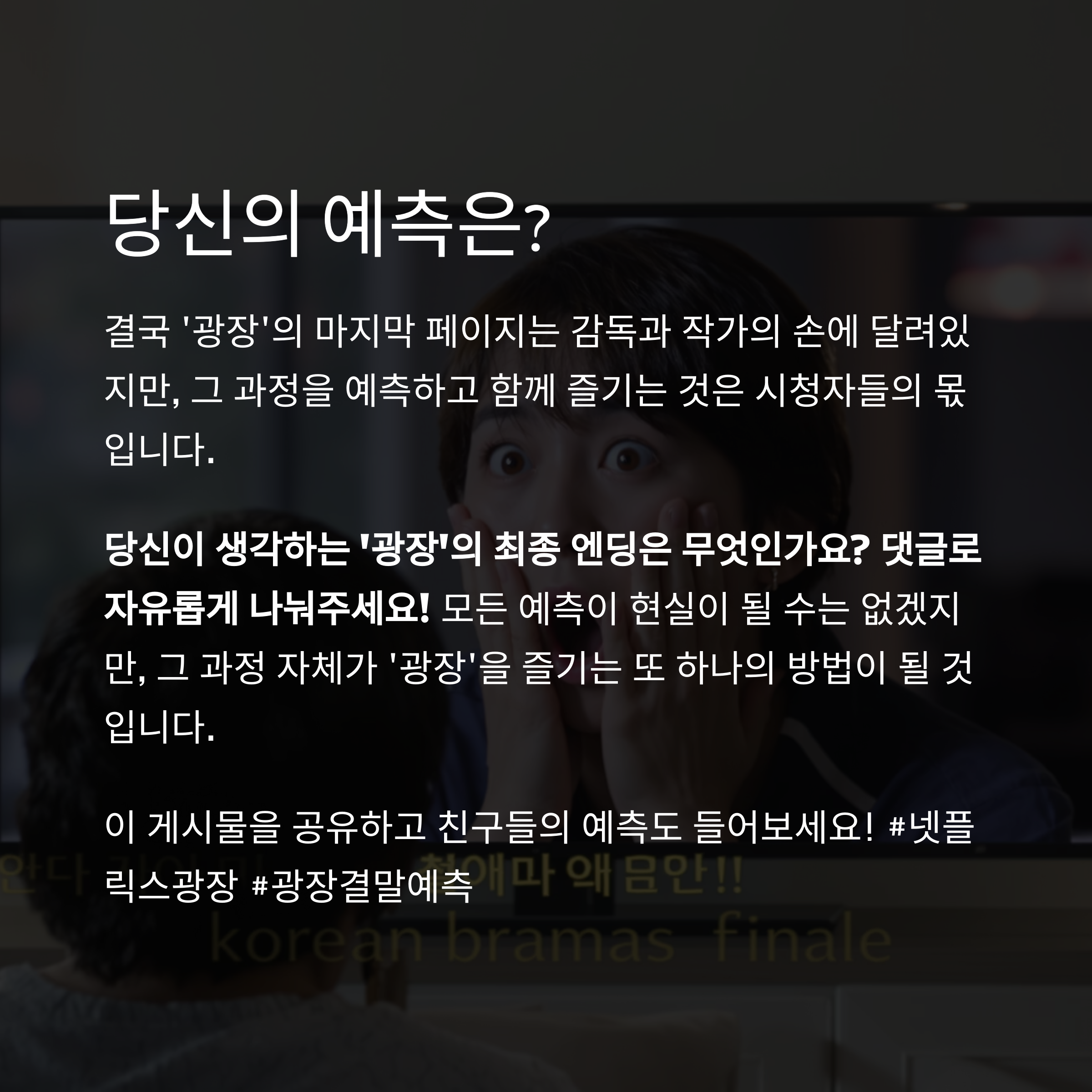 결국 '광장'의 마지막 페이지는 감독과 작가의 손에 달려있지만, 그 과정을 예측하고 함께 즐기는 것은 시청자들의 몫입니다.