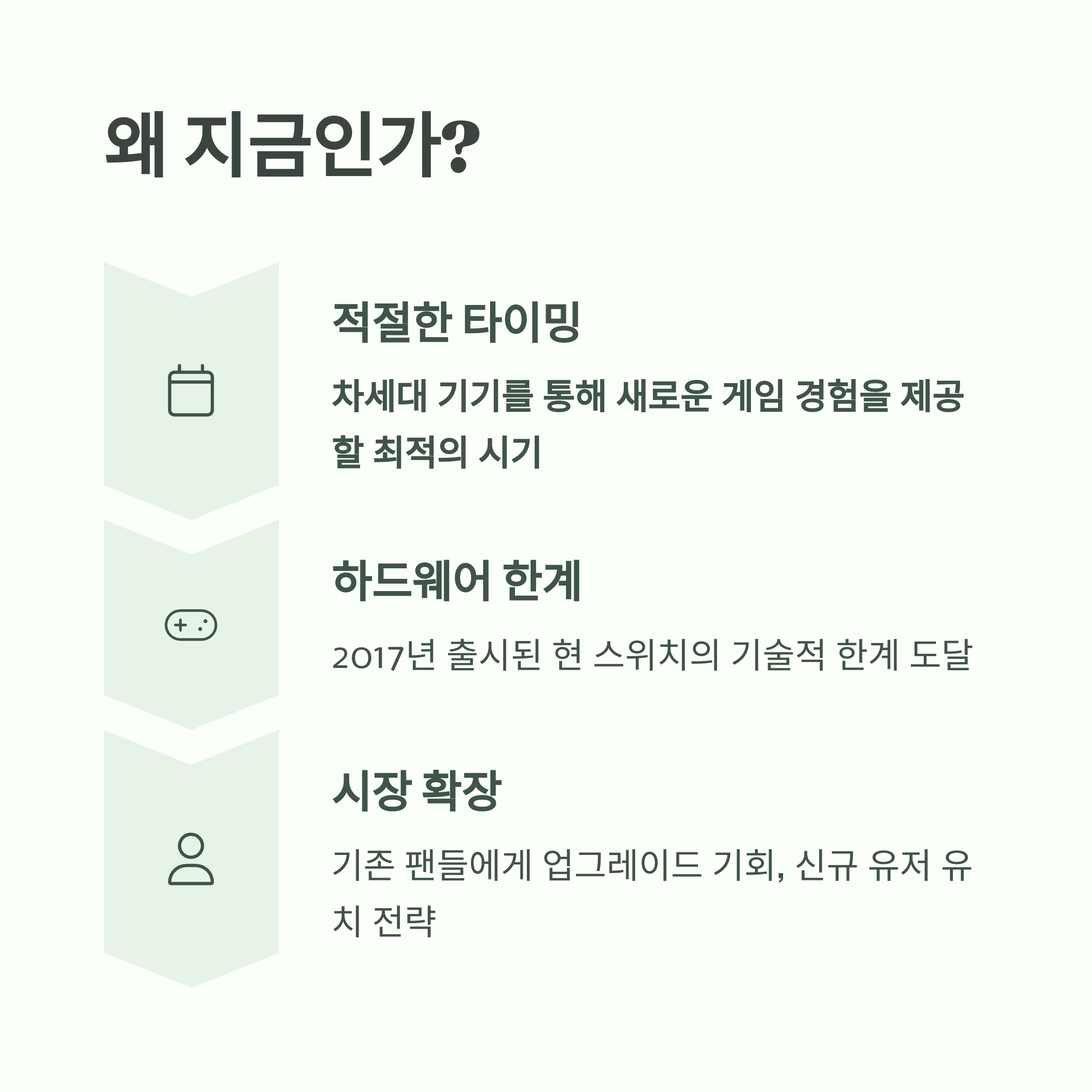 닌텐도만이 제공할 수 있는 독창적이고 재미있는 게임 경험, 가족 모두가 함께 즐길 수 있는 폭넓은 콘텐츠, 그리고 휴대성과 거치형의 장점을 결합한 독보적인 사용 편의성을 더욱 강화해야 합니다.