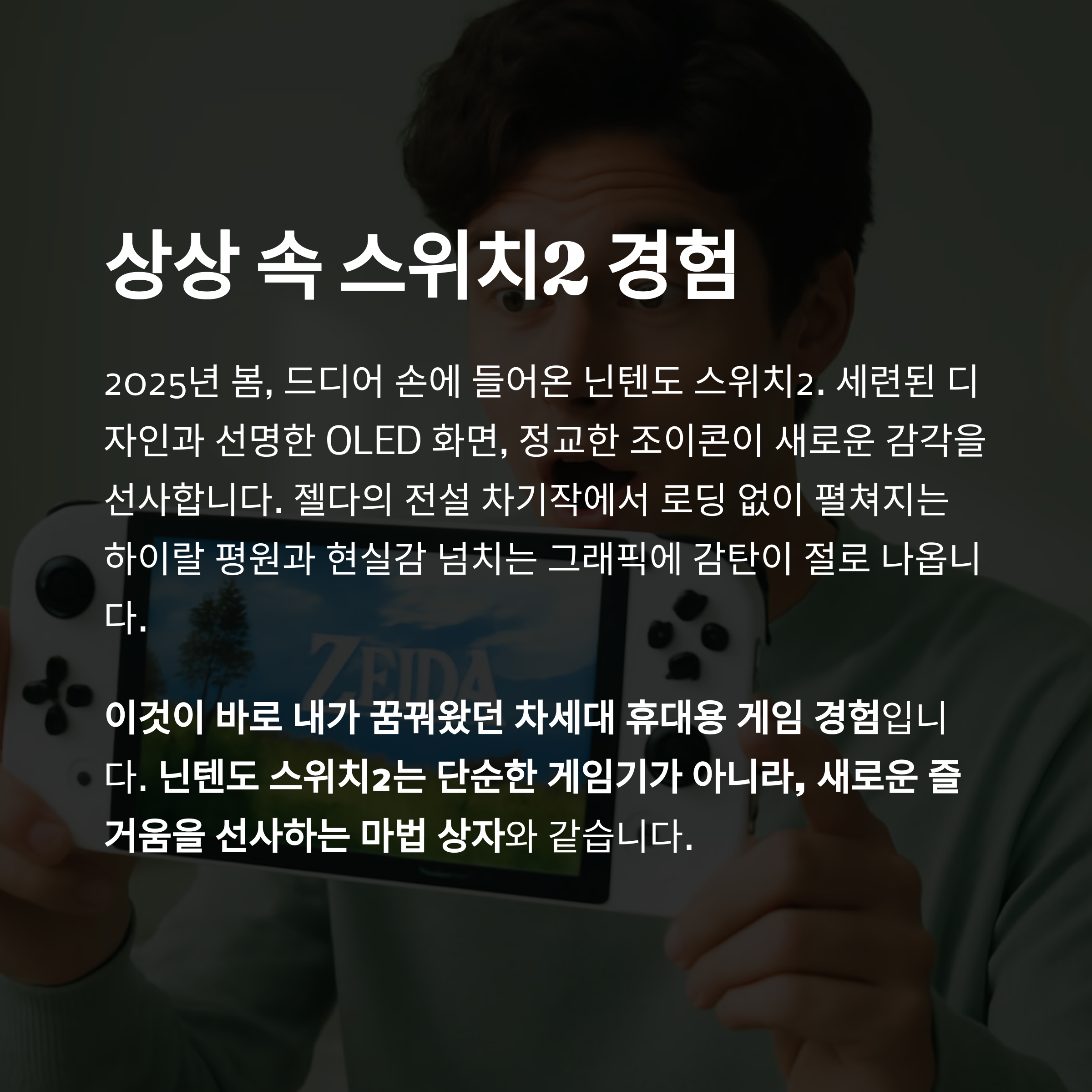 향상된 성능과 여전한 휴대성 덕분에 언제 어디서든 최고의 게임 경험을 누릴 수 있게 되는 것, 이것이 바로 스위치 2가 가져올 마법입니다.