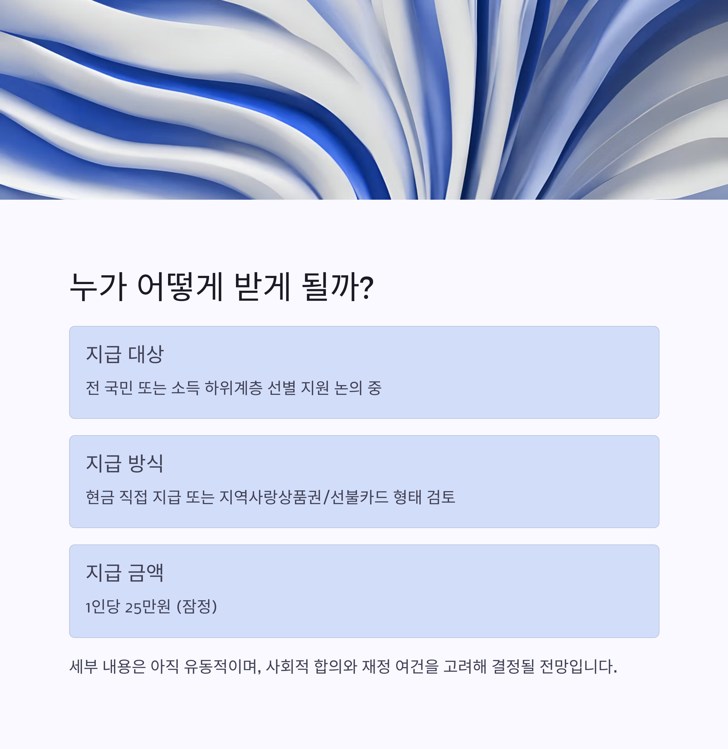 이번 지원금은 1인당 25만원 규모로, 많은 분들이 신청 자격과 방법에 대해 궁금해하고 계십니다.