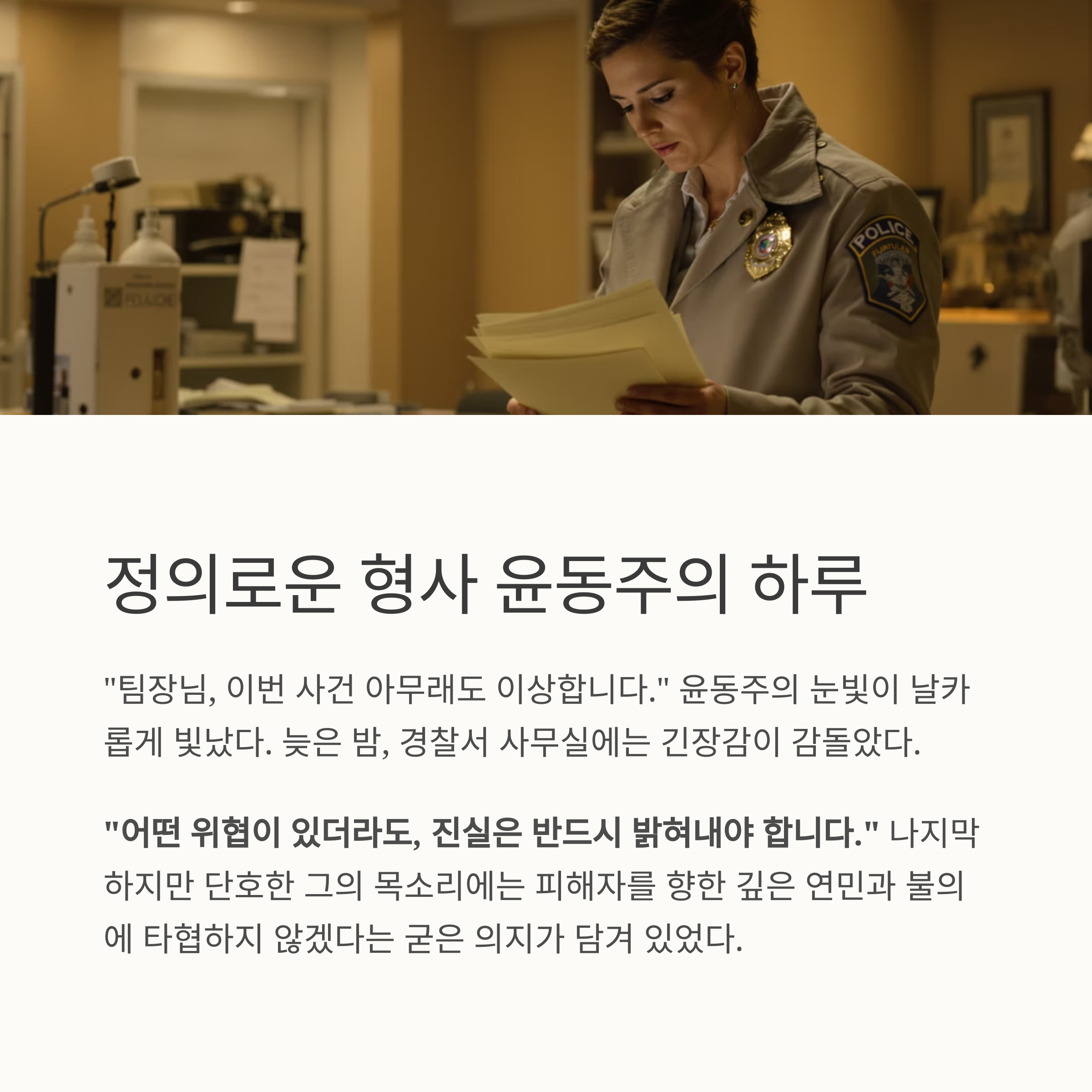 동주는 책상 위에 놓인 사건 파일을 다시 한번 꼼꼼히 살폈다.