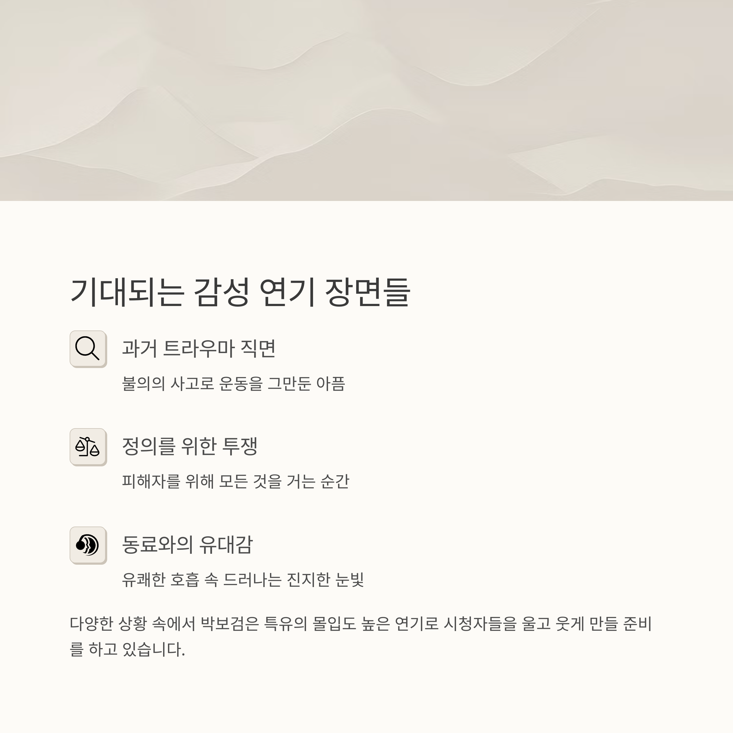 | 다층적인 감정 표현 | 코믹함과 진지함, 강인함과 부드러움을 넘나드는 입체적 연기 |