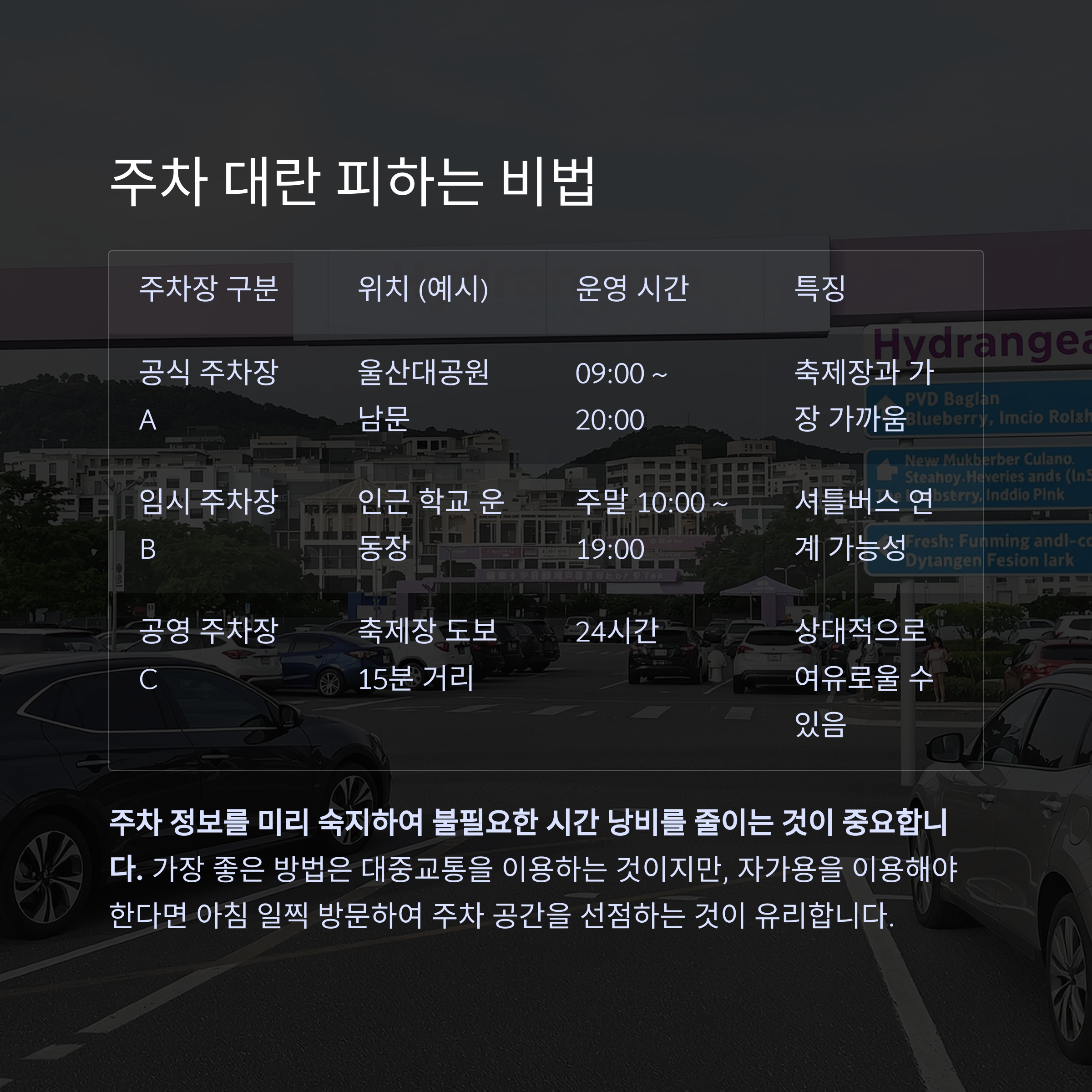 | 공식 주차장 A | 울산대공원 남문 | 09:00 ~ 20:00 | 축제장과 가장 가까움 |