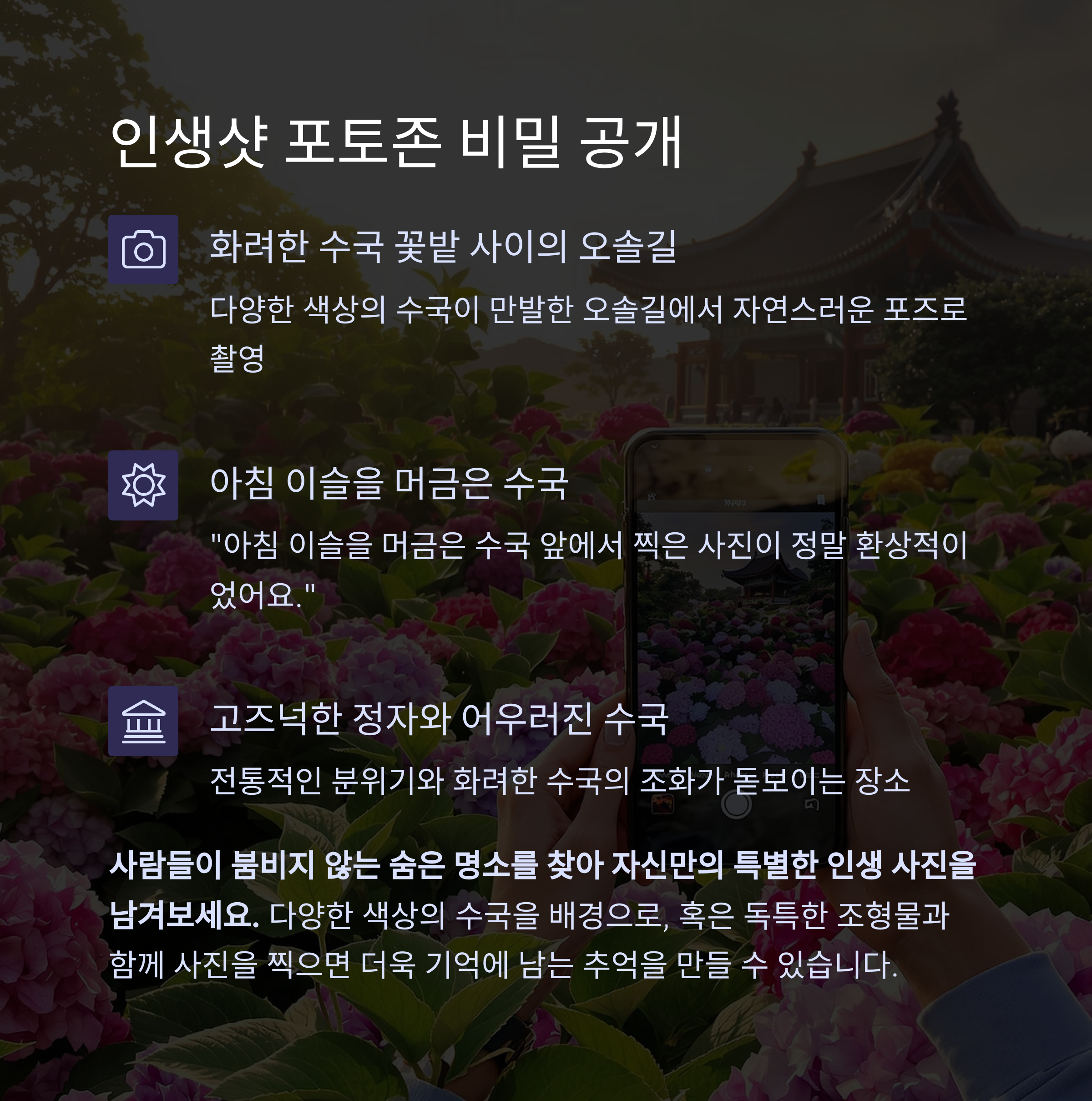 화려한 수국 꽃밭 사이의 오솔길, 고즈넉한 정자와 어우러진 수국, 그리고 특정 시간대에 햇살을 받아 더욱 아름답게 빛나는 장소들이 바로 그곳입니다.