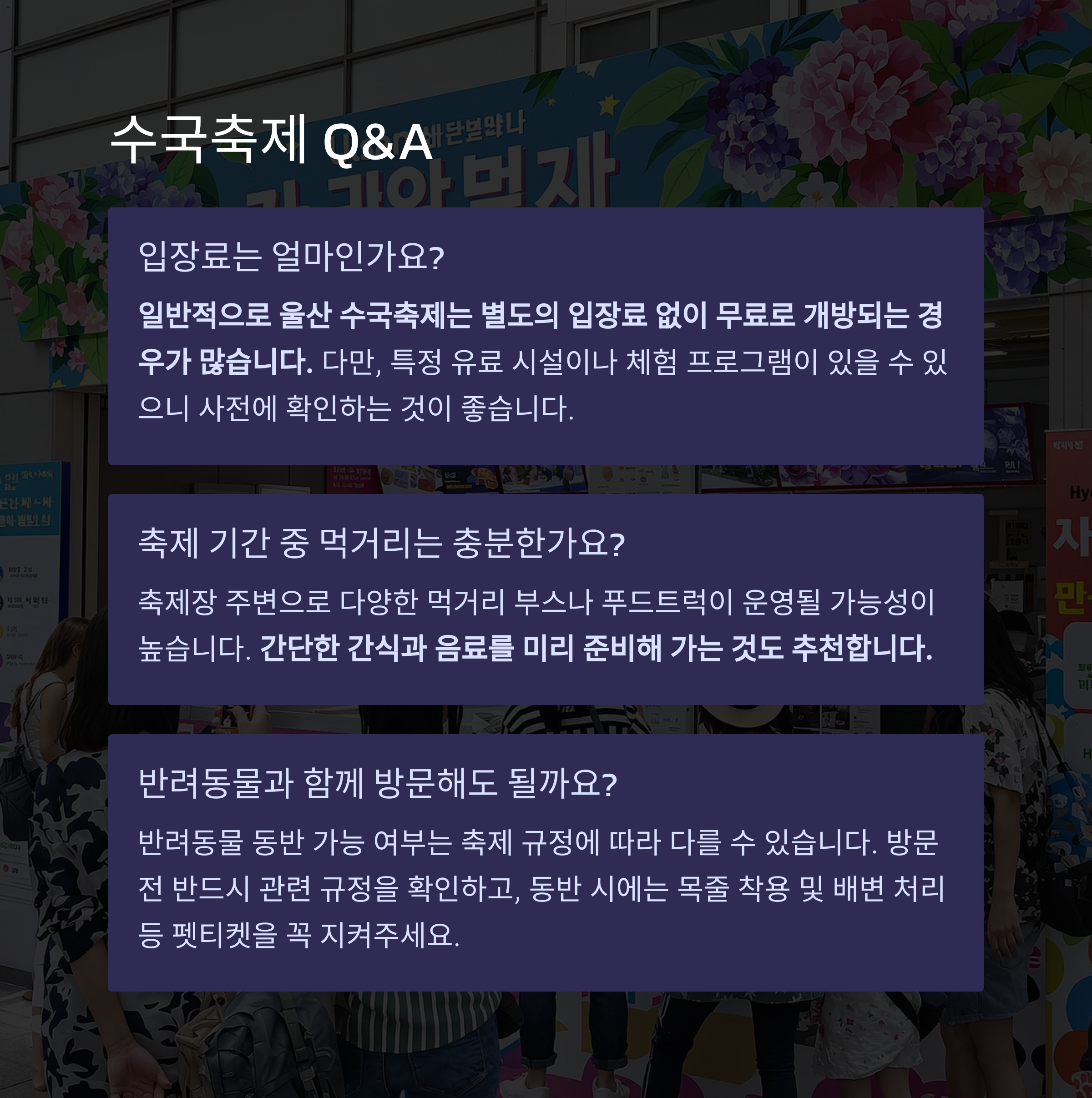 A: 반려동물 동반 가능 여부는 축제 규정에 따라 다를 수 있습니다.