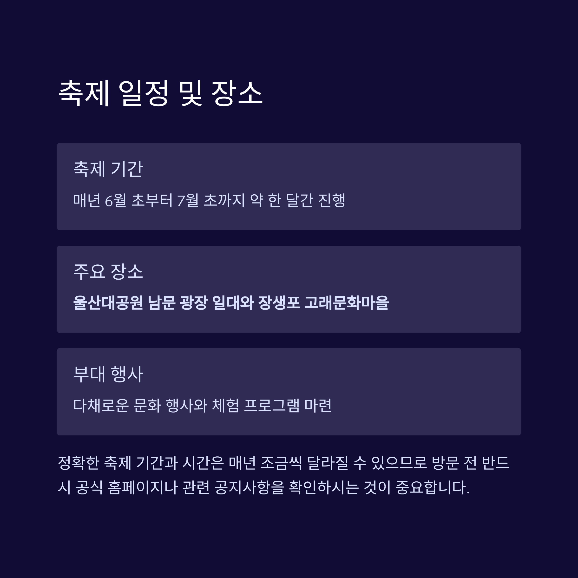 주요 축제 장소는 울산대공원 남문 광장 일대와 장생포 고래문화마을 등입니다.