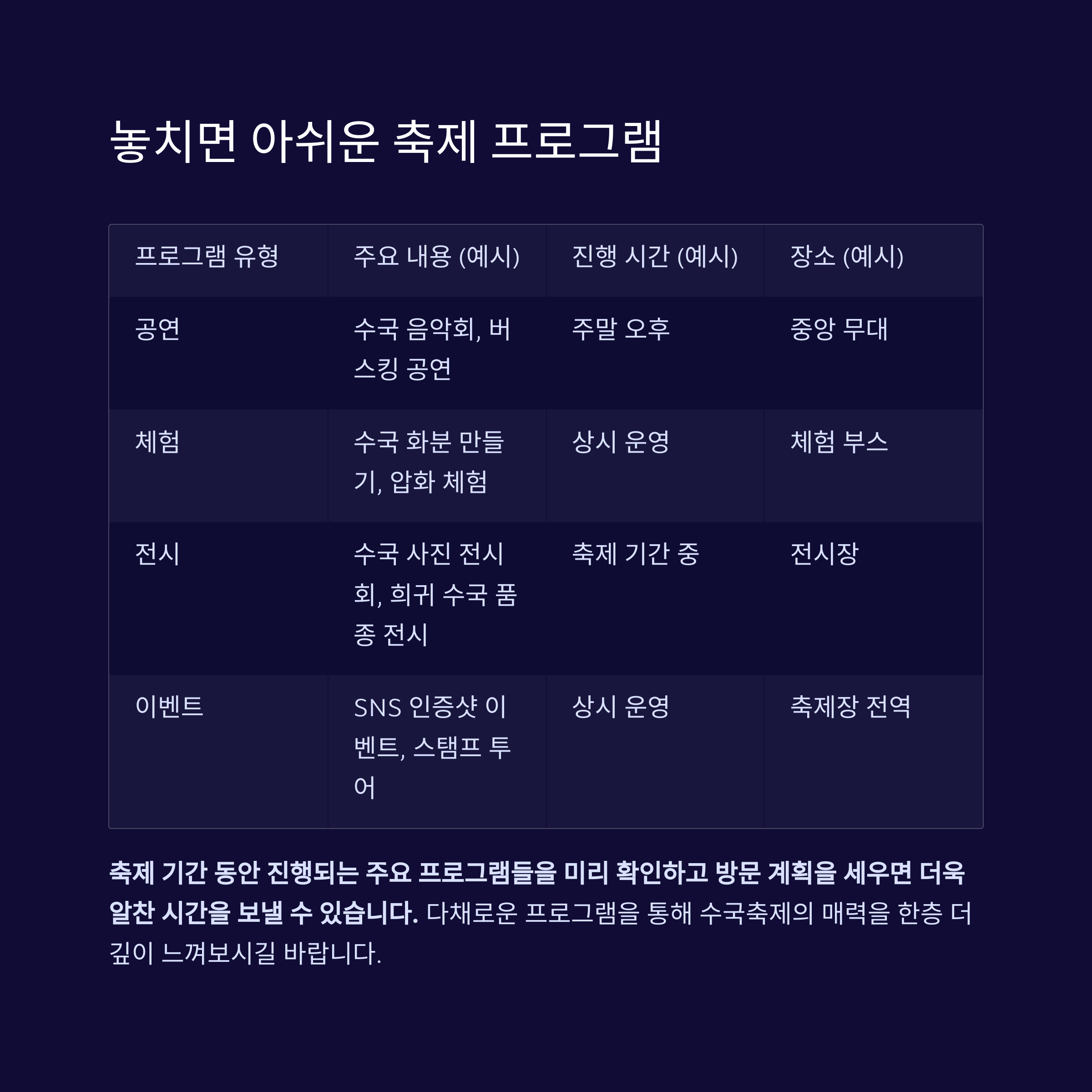 축제 기간 동안 진행되는 주요 프로그램들을 미리 확인하고 방문 계획을 세우면 더욱 알찬 시간을 보낼 수 있습니다.