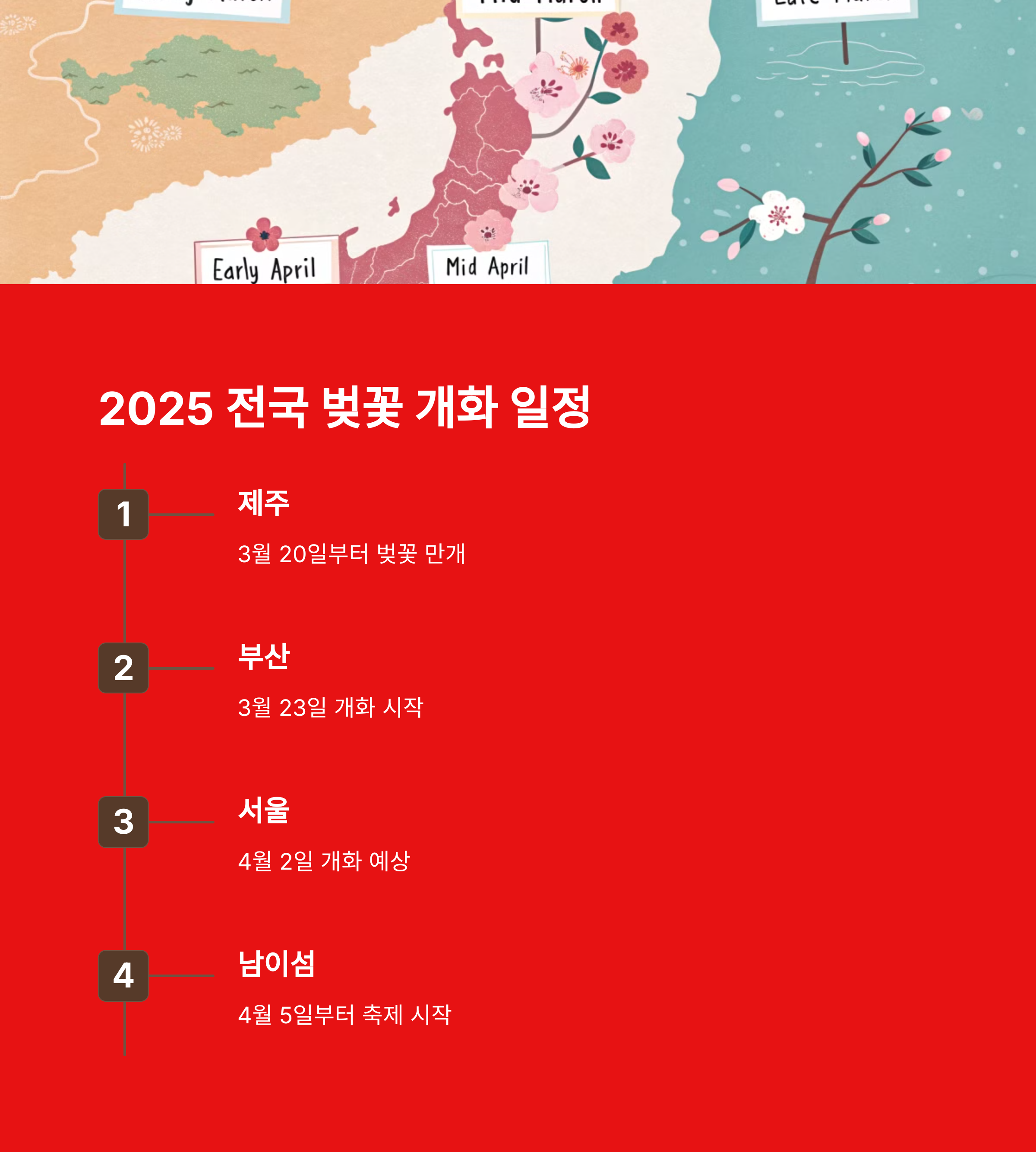2025년에는 평균 기온이 전년보다 다소 낮아 개화 시기가 약간 늦어질 것으로 예상됩니다. 벚꽃은 개화 후 약 2주간 지속되며, 만개 후 일주일 정도 지나면 낙화가 시작됩니다. 2025년 예상 개화 시기는 다음과 같습니다.