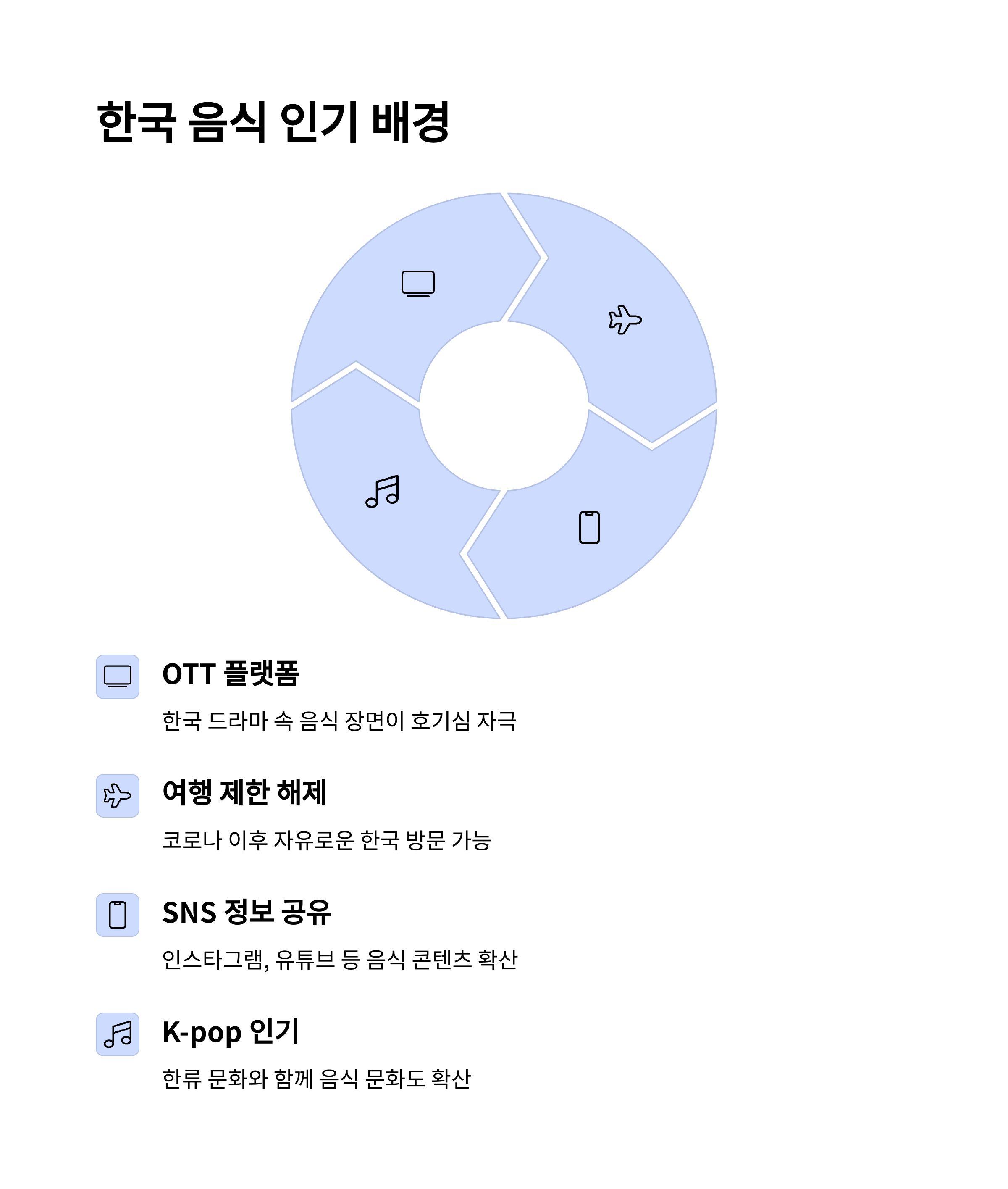 - 유튜브, 인스타그램, 틱톡 등 소셜 미디어를 통한 한국 음식 정보 공유 증가