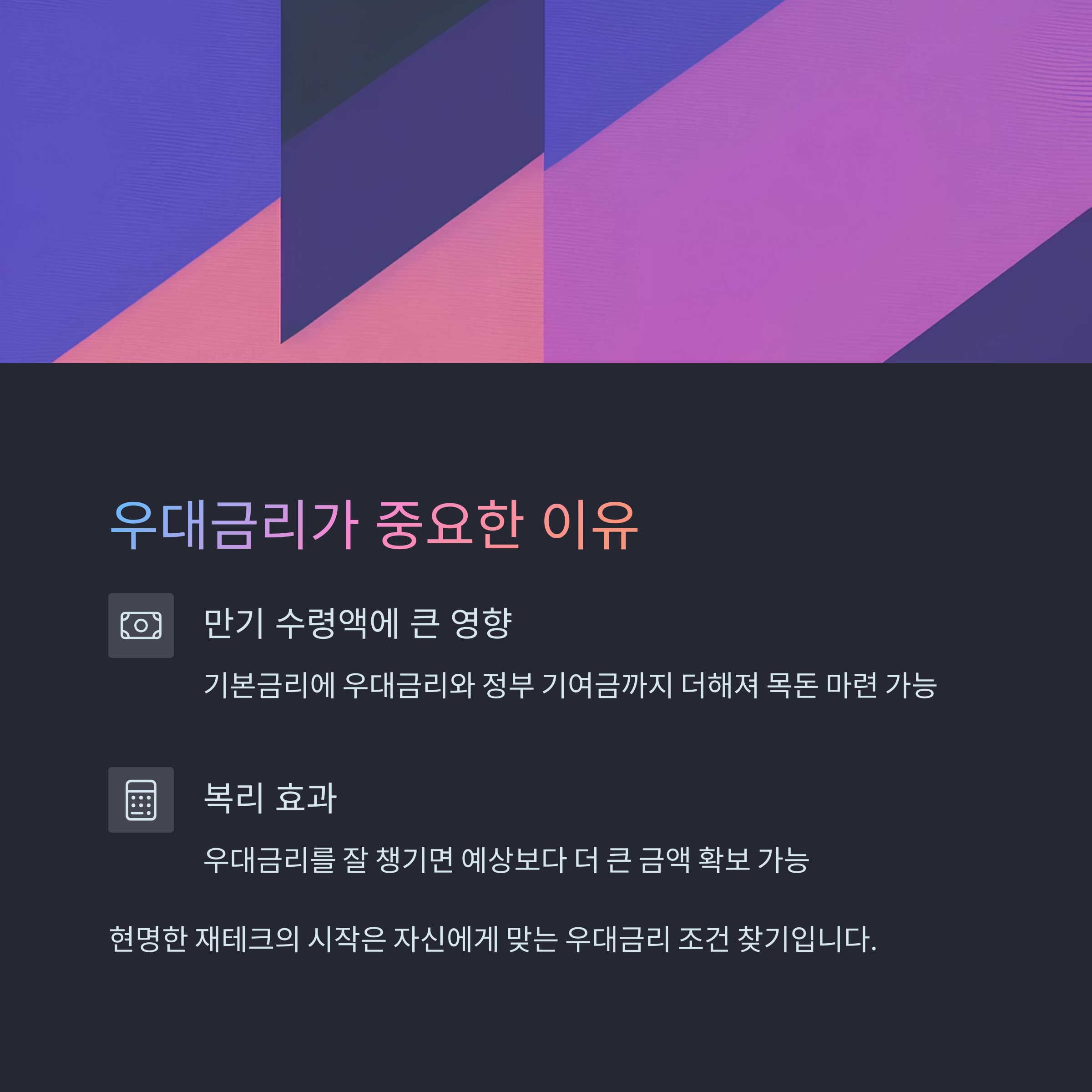 우대금리를 잘 챙기면 복리 효과까지 더해져 예상보다 더 큰 목돈을 마련할 수 있습니다.