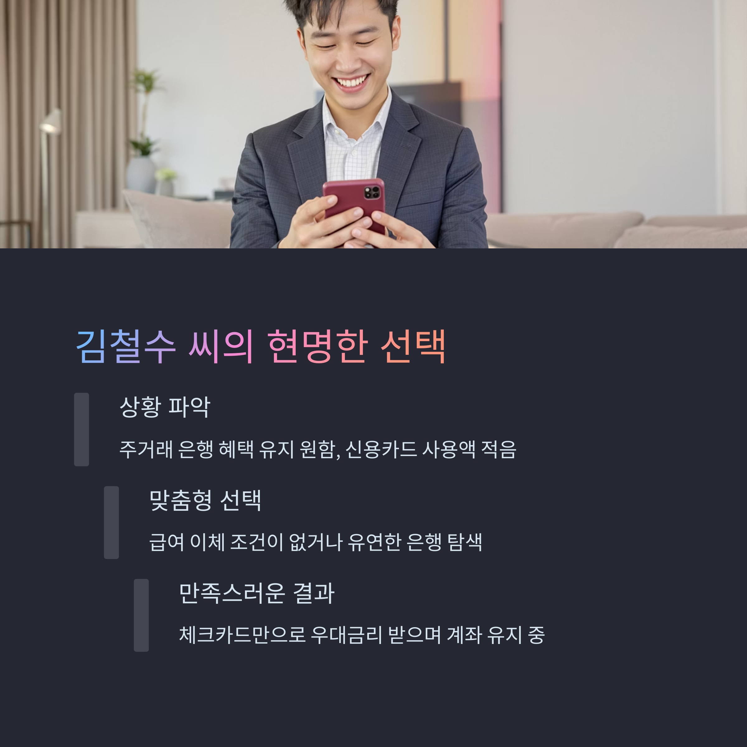고민 끝에 김철수 씨는 자신의 현재 상황에 맞춰 급여 이체 조건이 없거나 유연하고, 체크카드 사용 실적만으로도 우대금리를 받을 수 있는 은행을 선택했습니다.