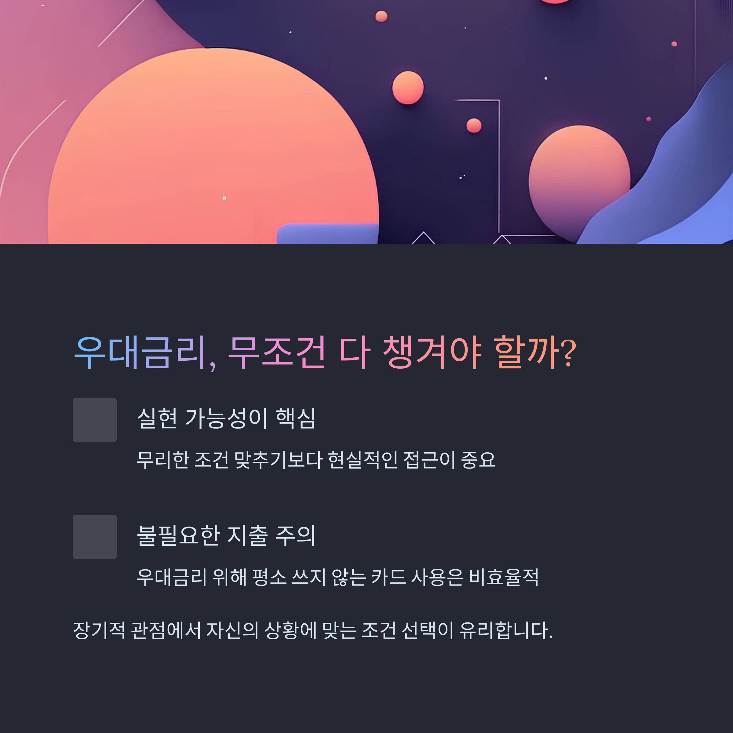자신의 상황에 맞춰 현실적으로 달성 가능한 우대금리 조건을 선택하는 것이 장기적으로 유리합니다.