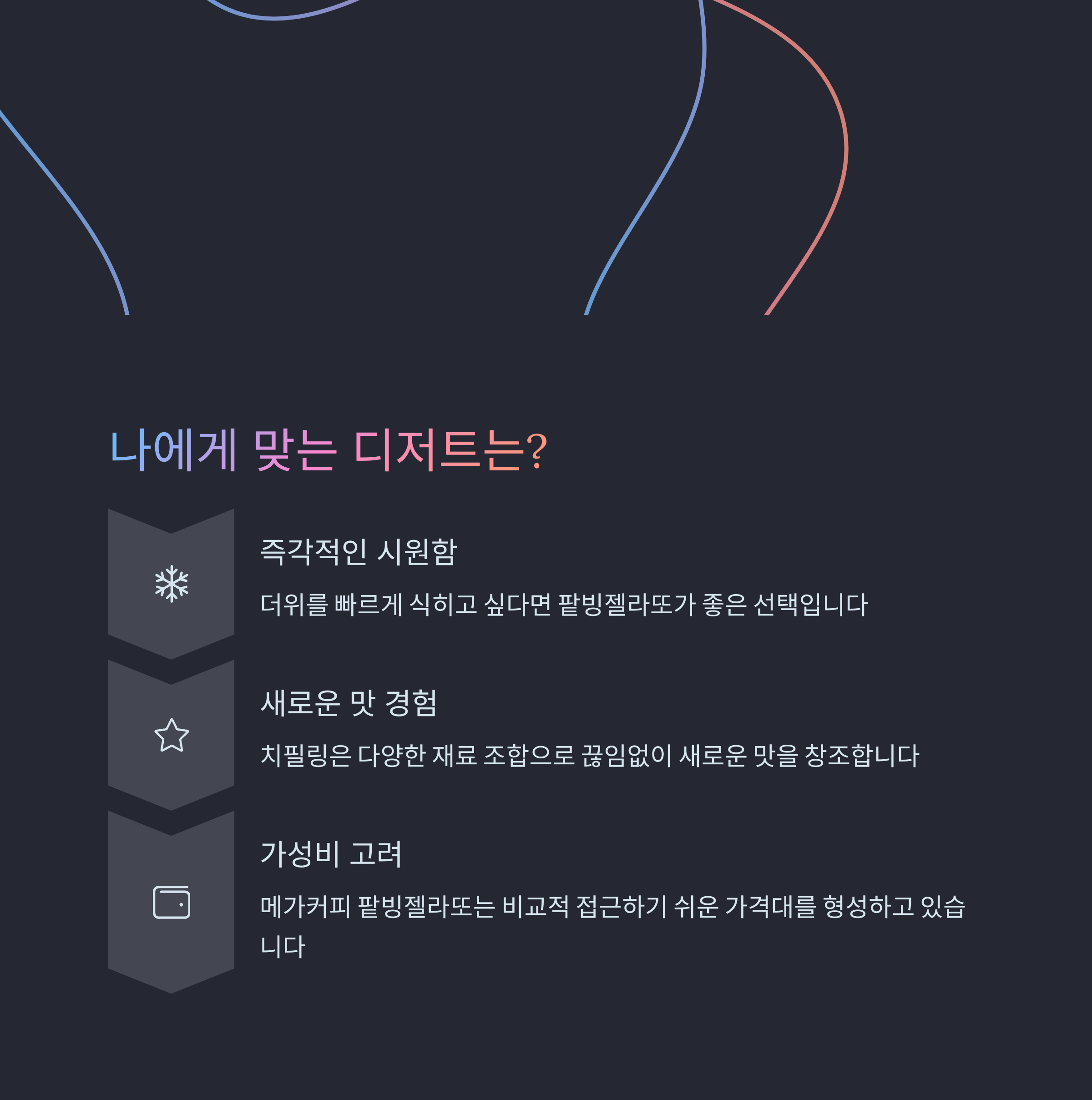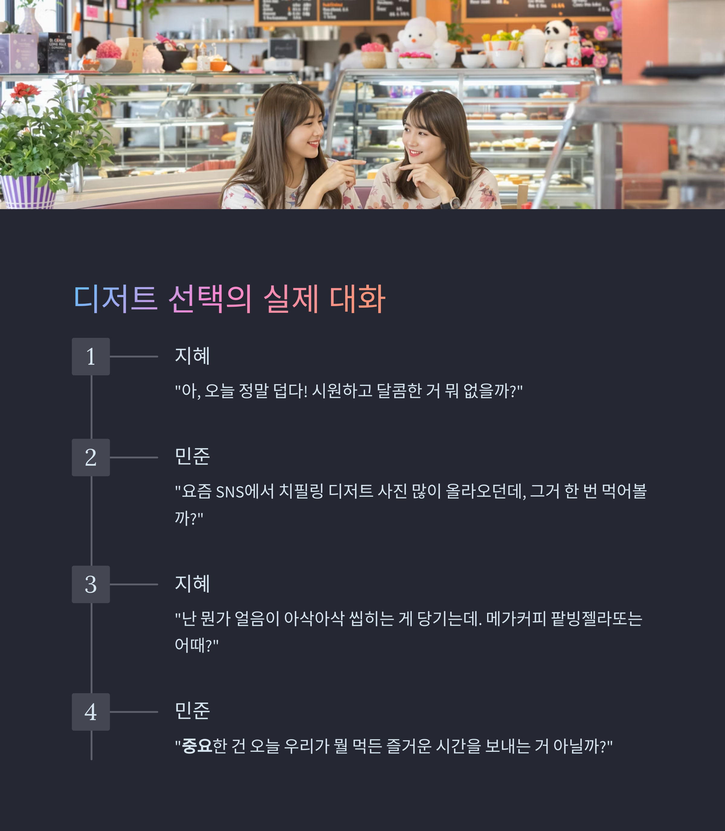 지혜: 음, 치필링도 좋지만 난 뭔가 얼음이 아삭아삭 씹히는 게 당기는데. 참, 메가커피 팥빙젤라또 새로 나왔다던데 그건 어때? 팥도 듬뿍이고 젤라또까지 올라간다더라.