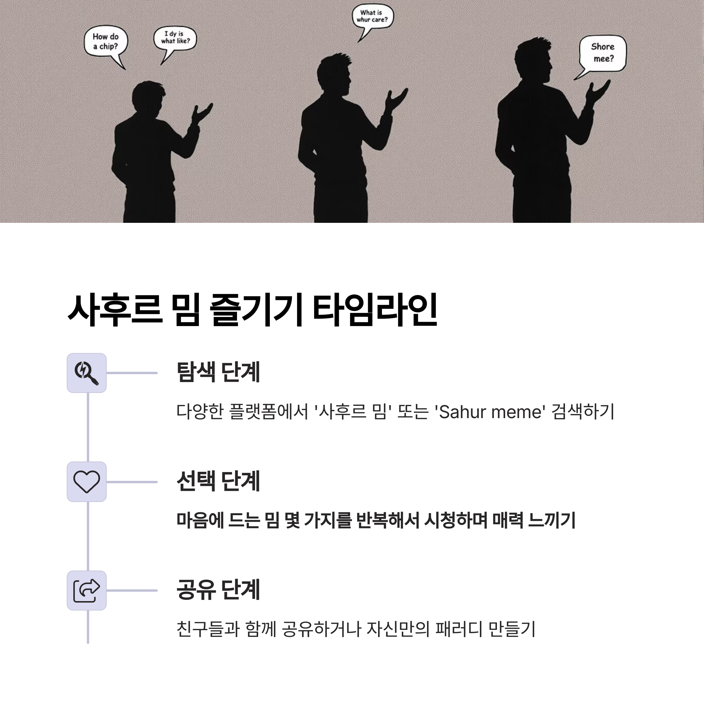 가장 먼저, 다양한 플랫폼에서 '사후르 밈' 또는 'Sahur meme'을 검색해보세요.