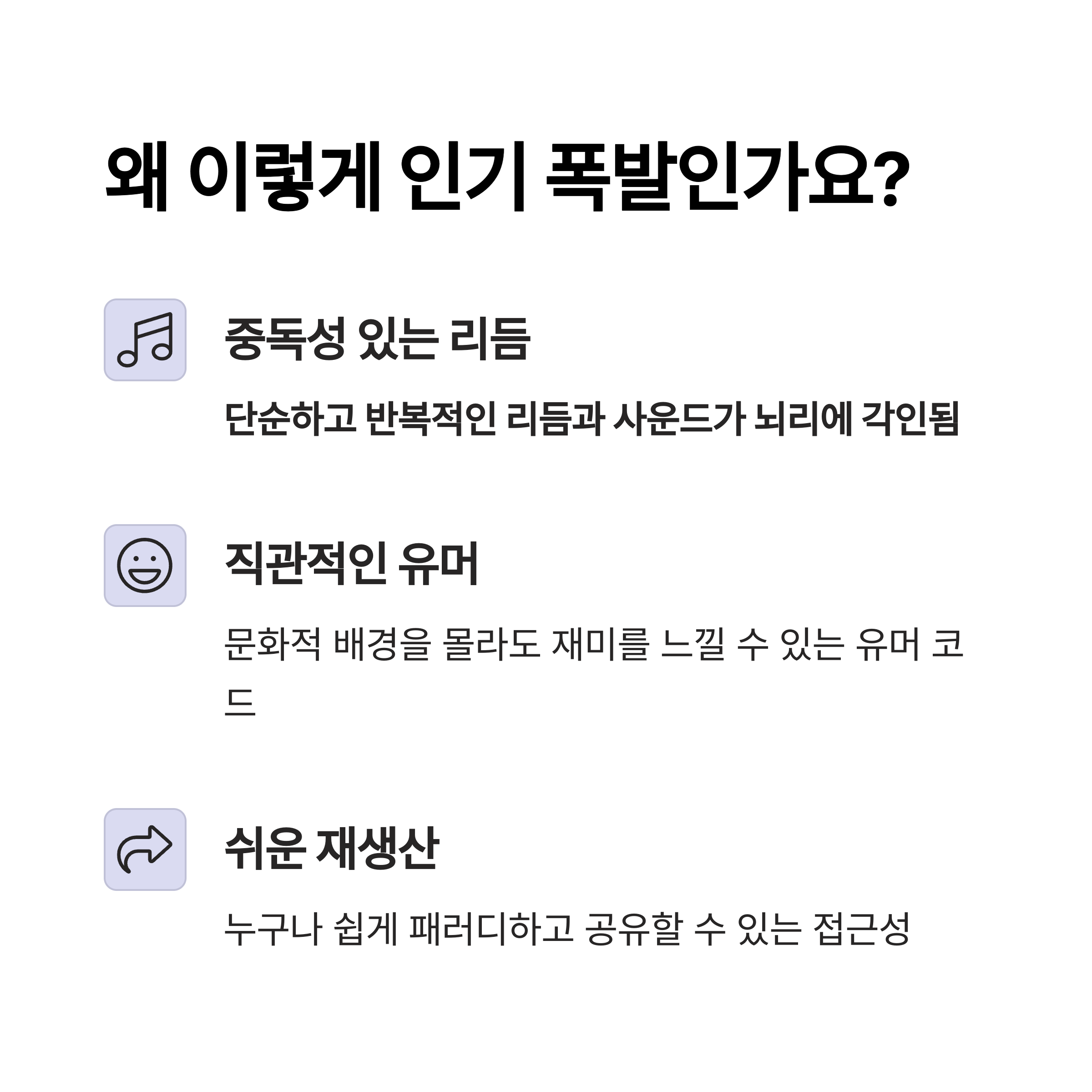 마지막으로, 누구나 쉽게 패러디하고 재생산할 수 있다는 점도 인기 확산에 큰 역할을 하고 있습니다.