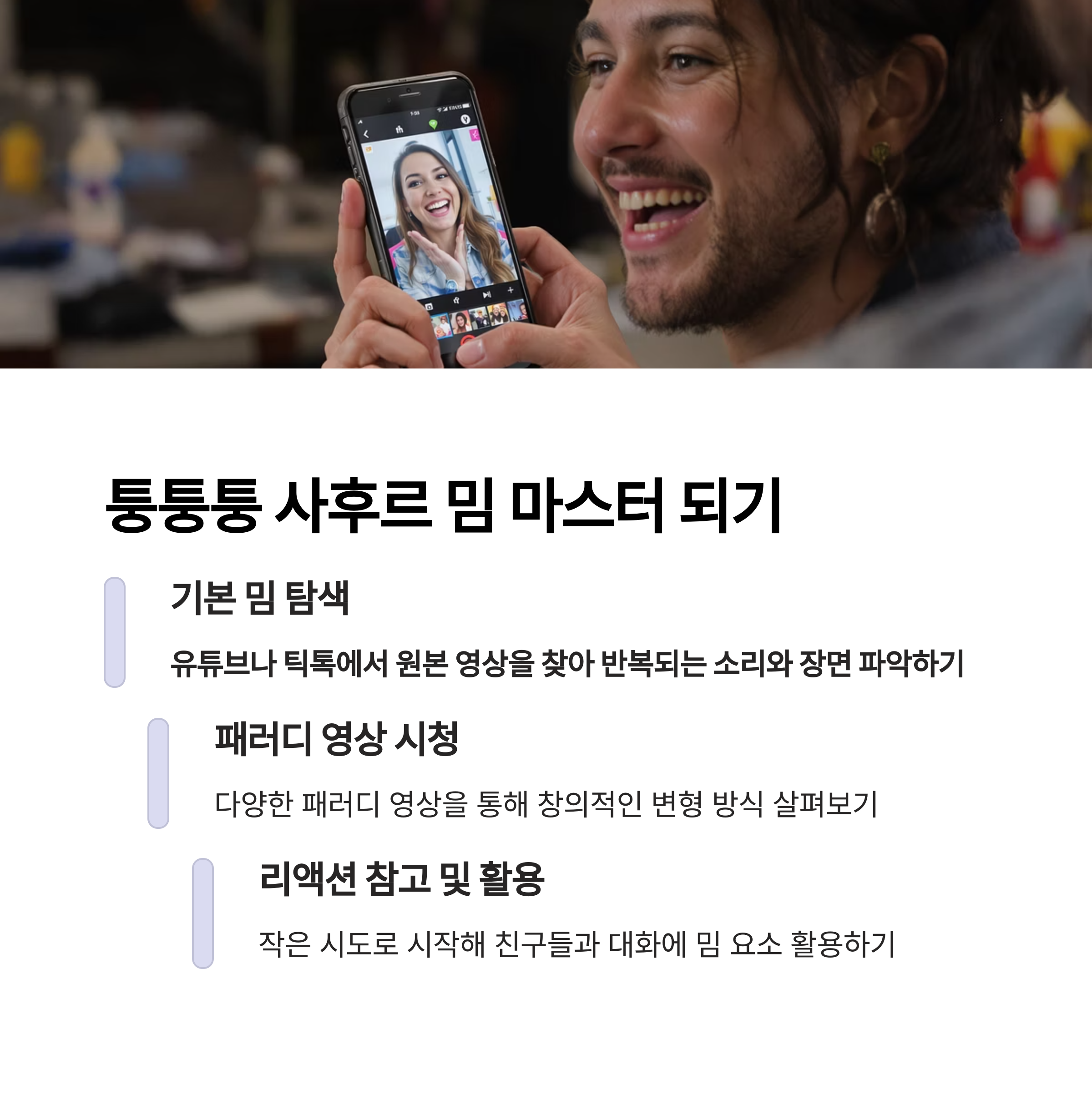 1단계: 기본 밈 탐색: 유튜브나 틱톡에서 '퉁퉁퉁 사후르' 원본 또는 인기 영상을 찾아 시청합니다.