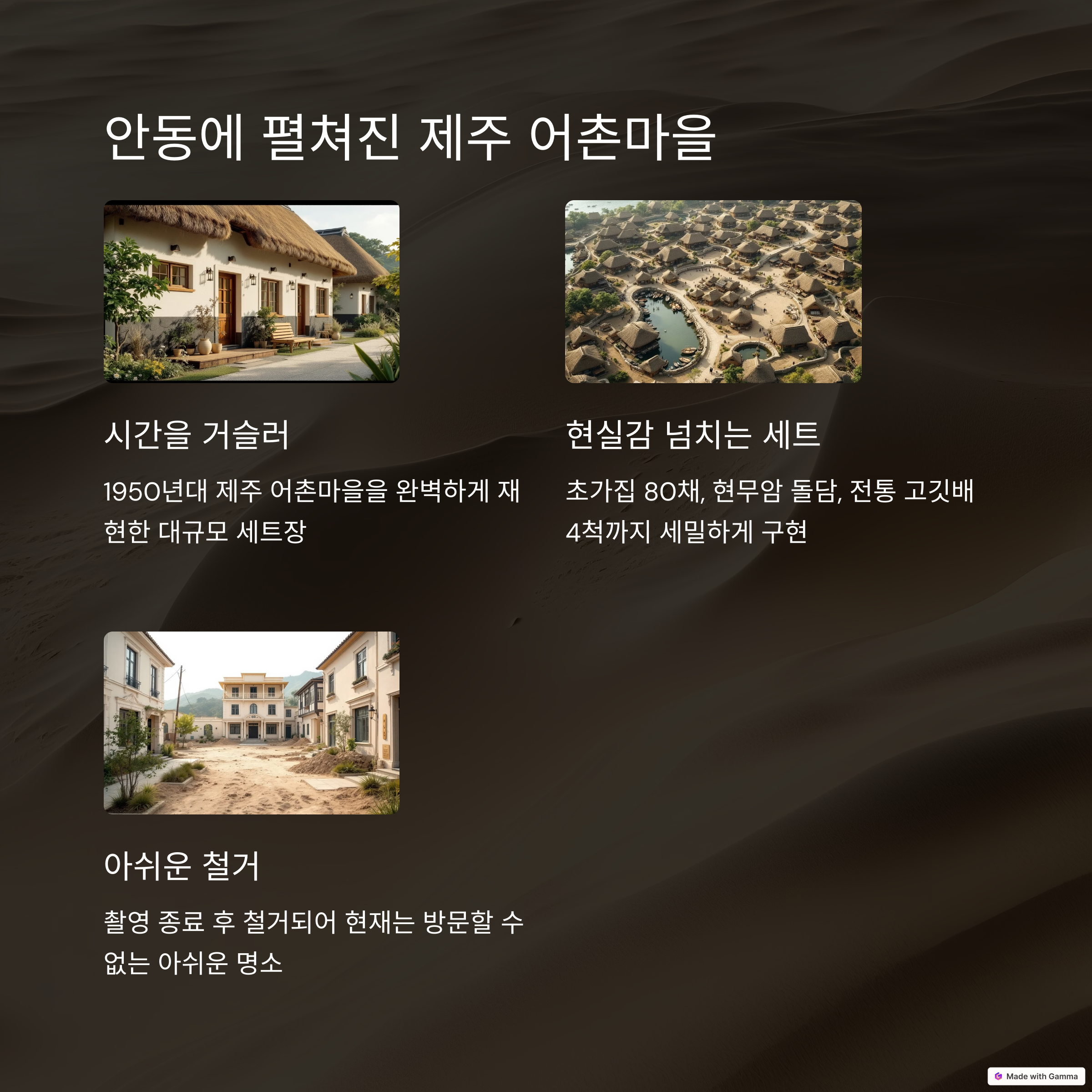안동에서는 1950년대 제주도 어촌마을을 재현한 세트장에서 촬영이 이루어졌습니다. 이곳은 드라마 속에서 과거 제주 주민들의 삶을 생생하게 재현하며, 시대적 배경을 더욱 현실감 있게 표현하는 역할을 했습니다. 그러나 이 세트장은 촬영 종료 후 철거되