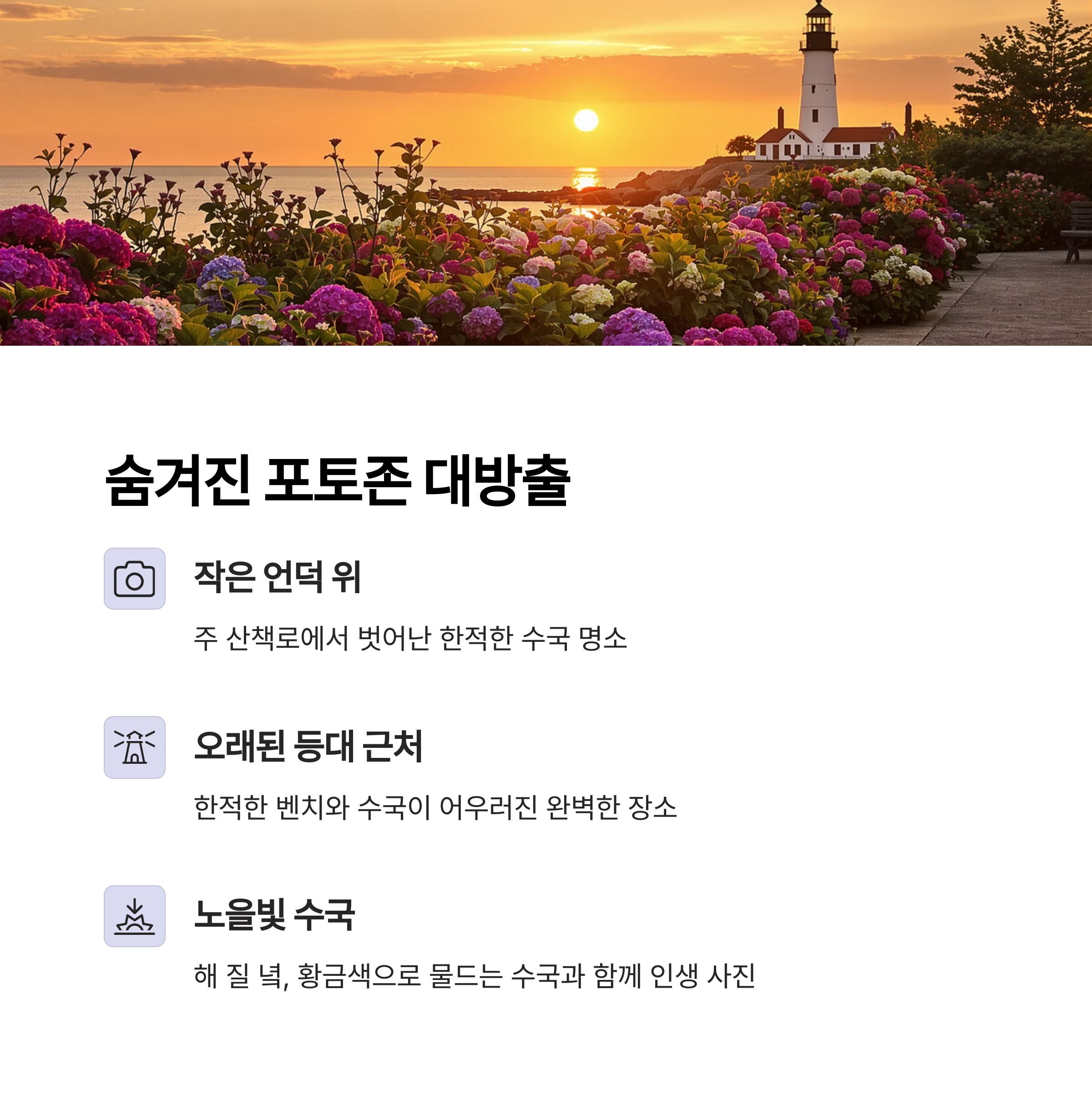 예를 들어, 주 산책로에서 살짝 벗어난 작은 언덕 위나, 오래된 등대 근처의 한적한 벤치는 수국을 배경으로 한적하고 평화로운 분위기의 사진을 남기기에 완벽한 장소입니다.