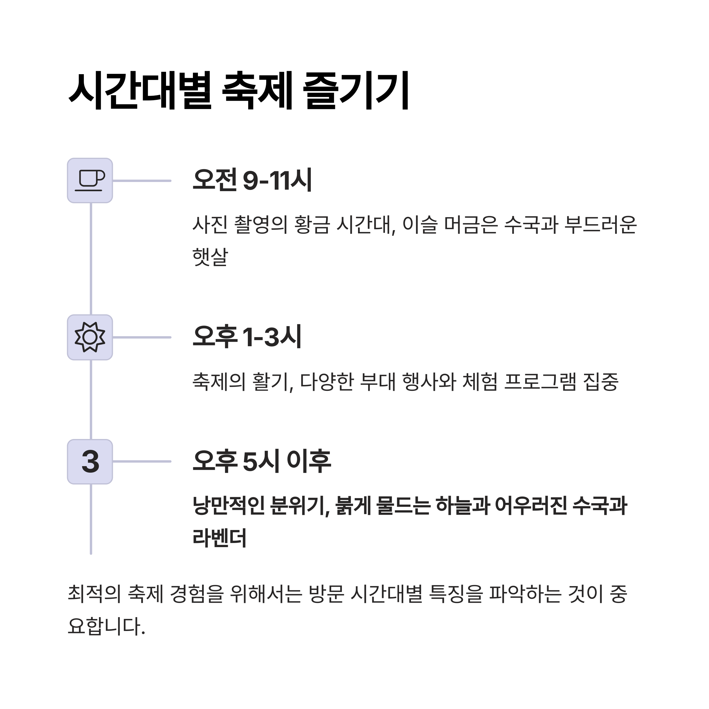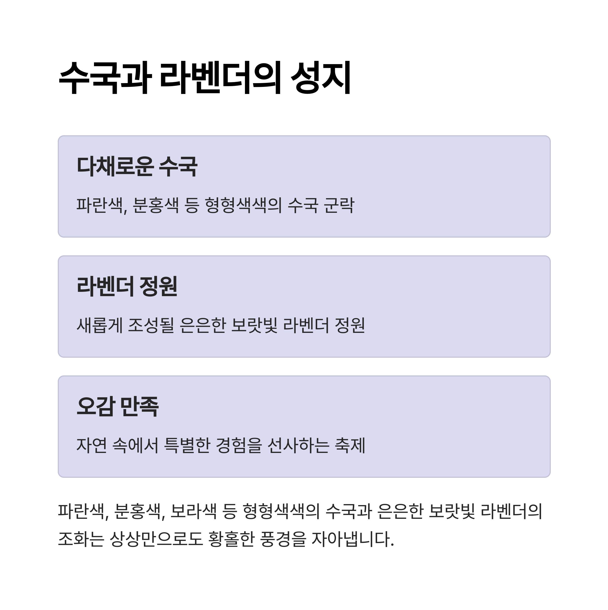 이 글은 단순히 알려진 장소를 넘어, 잘 드러나지 않은 비밀스러운 포토 스팟과 향기로운 라벤더 명소를 중심으로 축제를 더욱 깊이 있게 즐길 수 있는 정보를 제공하고자 합니다.